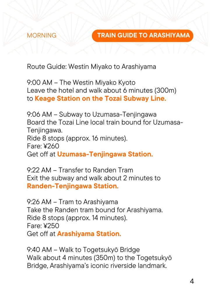 Yes! I’ll send it as a PDF you can save or print, so you’ll have it even if you’re offline. All the train, bus, and bullet train details are written out clearly, so you can get around without needing Wi-Fi. And just in case anything comes up, I’ll include my phone number for emergencies.